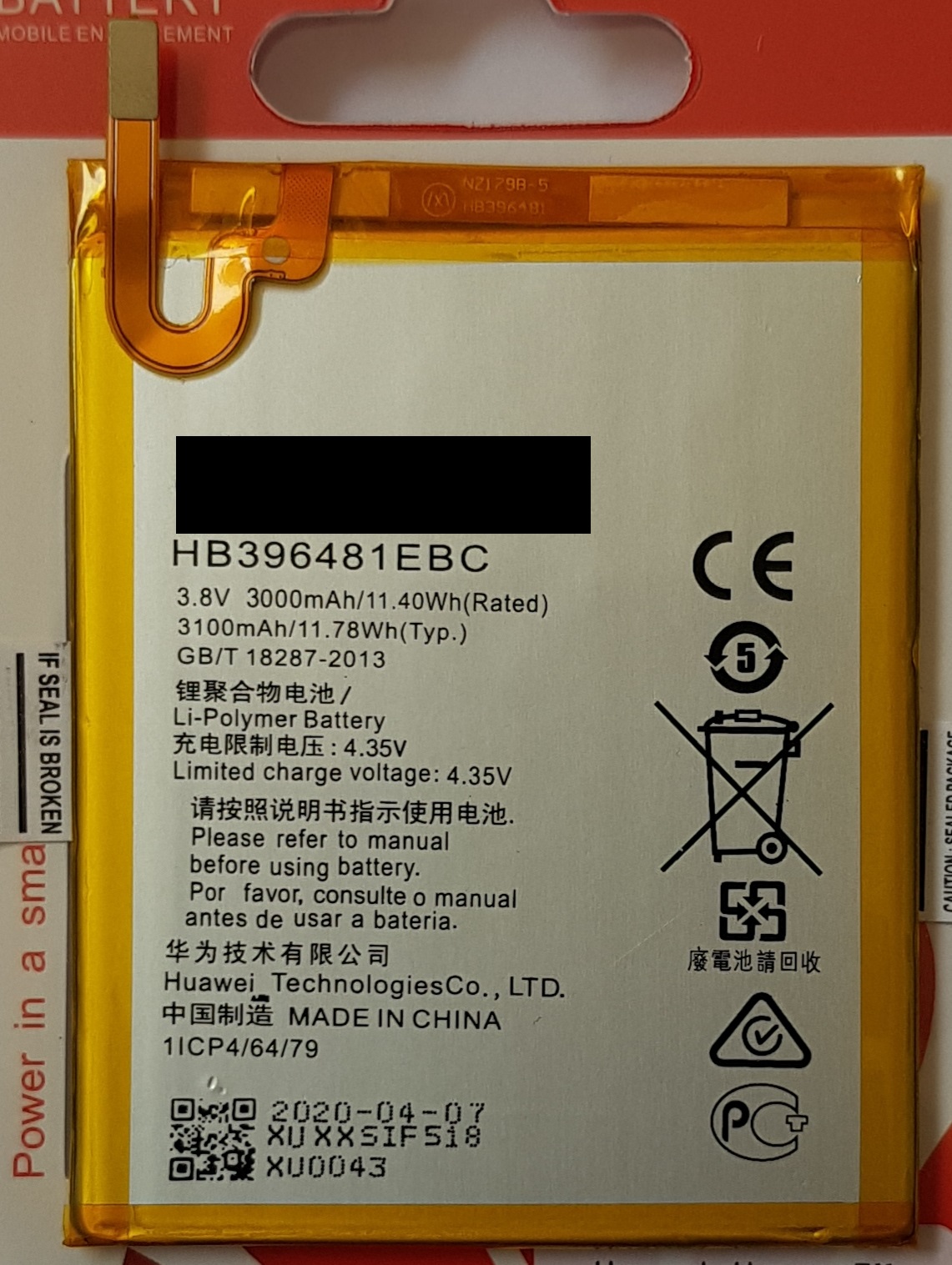 Аккумулятор для Huawei Honor 5X/MediaPad T3 7.0/Y6-2/G7 Plus/G8/G8X (HB396481EBC) - 3100mAh